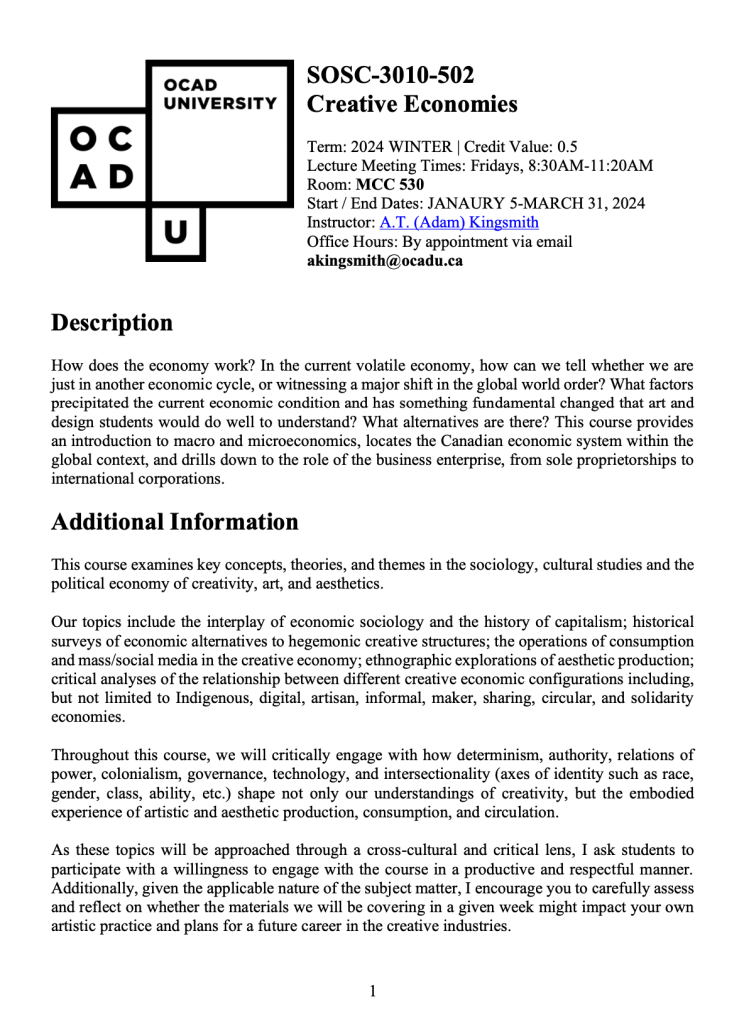 SOSC-3010 examines key concepts, theories, and themes in the sociology, cultural studies and the political economy of creativity, art, aesthetics, and creative production and technologies. Our topics centre around a critical analysis of the changing relationship between different creative economic configurations including, but not limited to Indigenous, digital, artisan, informal, maker, sharing, circular, and solidarity economies.