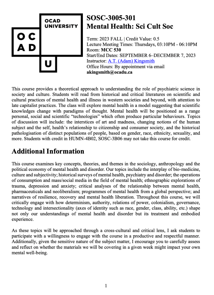 As an instructor at OCAD University, I teach courses on the scientific, cultural and social dimensions of mental health, as well as creative economics.
