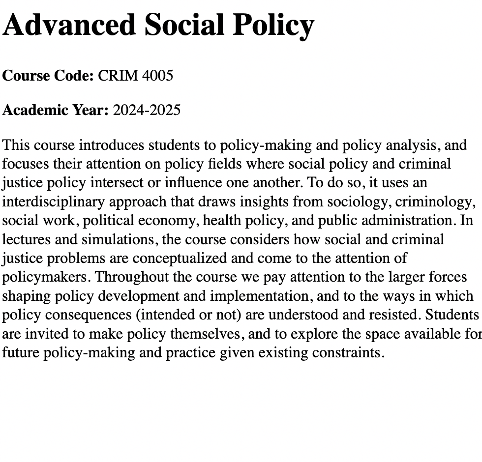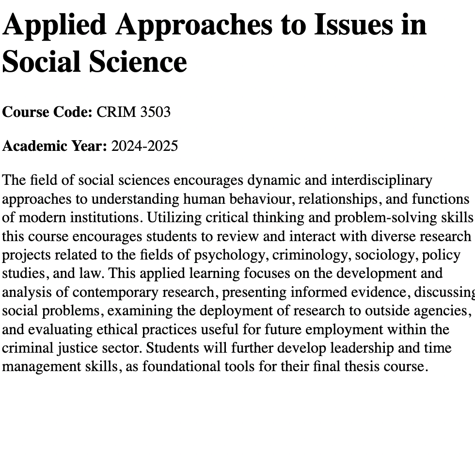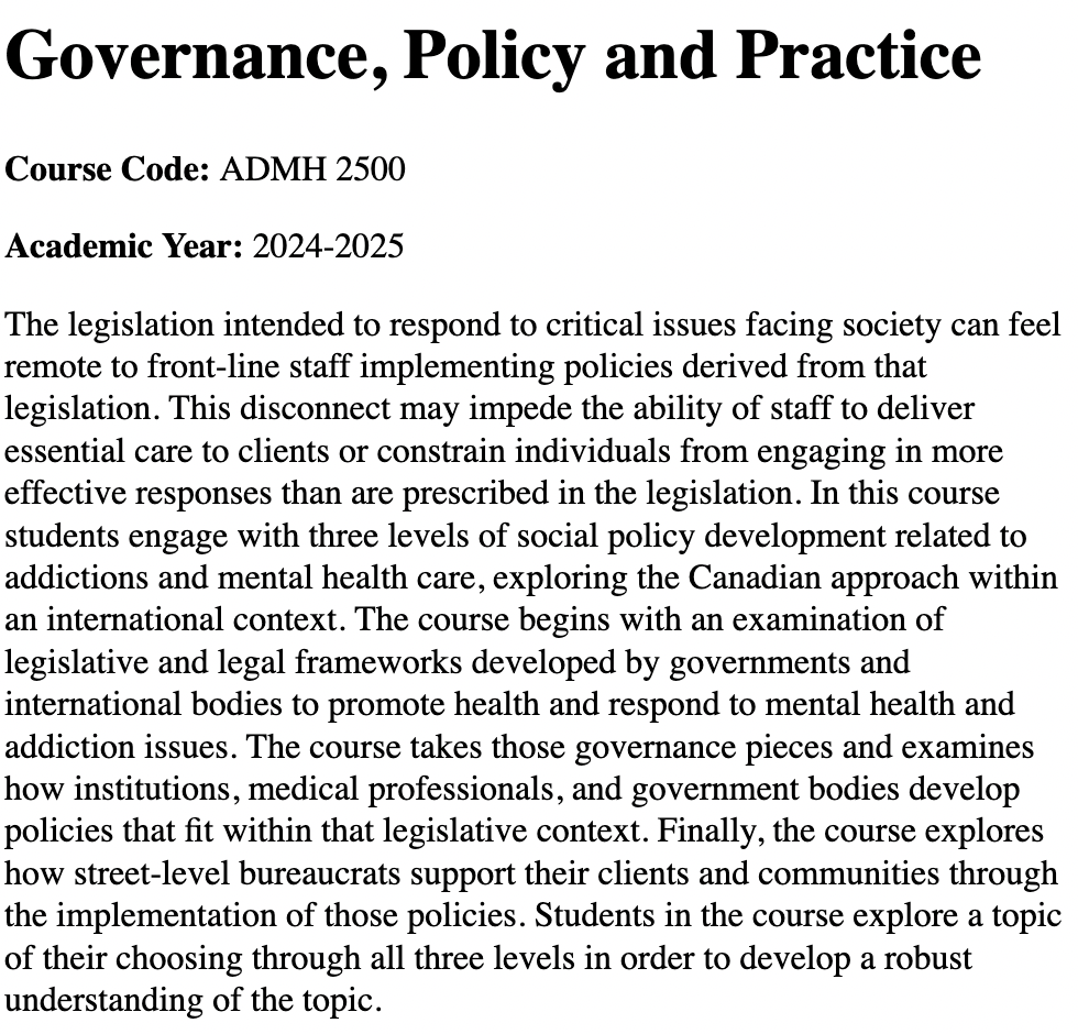 The syllabi listed below showcase these experiences, which have ranged from supervising thesis projects in 8-month research periods involving primary data collection, research ethics, analysis, and interpretation to managing the work field experiences. I redesigned research methods (CRIM 3503) and mental health policy courses (ADMH 2500), while achieving first-rate teaching evaluations in everything from second and third year introductory lectures to upper year seminar courses.