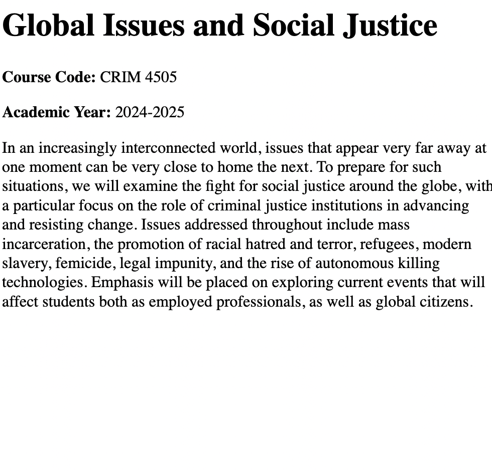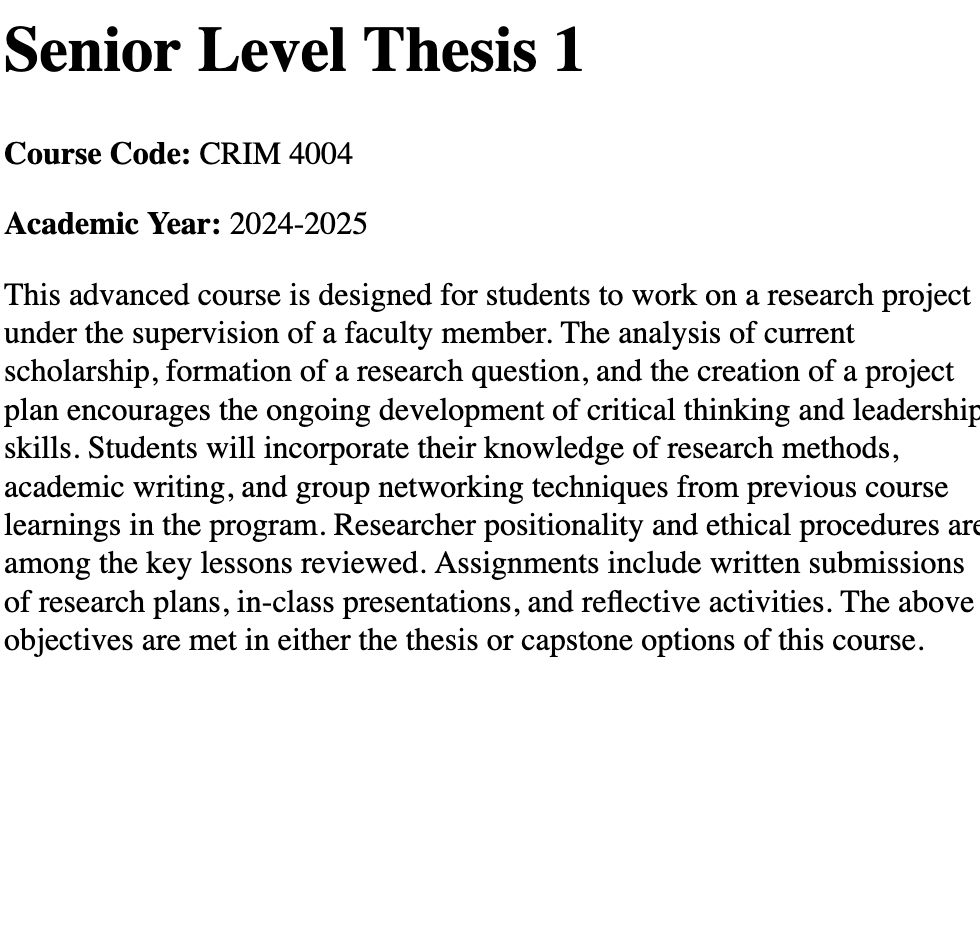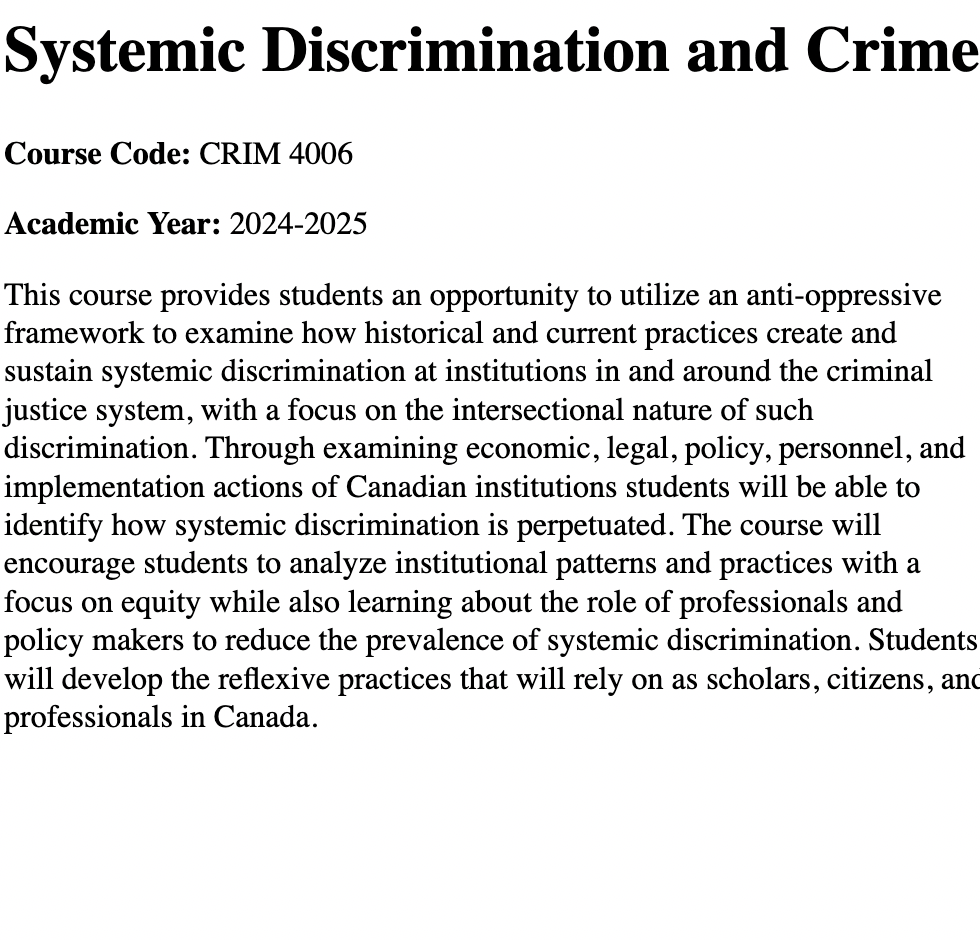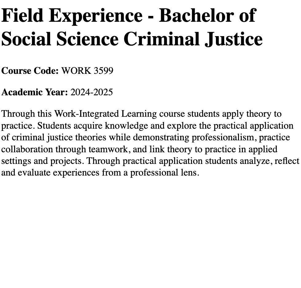 The syllabi listed below showcase these experiences, which have ranged from supervising thesis projects in 8-month research periods involving primary data collection, research ethics, analysis, and interpretation to managing the work field experiences. I redesigned research methods (CRIM 3503) and mental health policy courses (ADMH 2500), while achieving first-rate teaching evaluations in everything from second and third year introductory lectures to upper year seminar courses.
